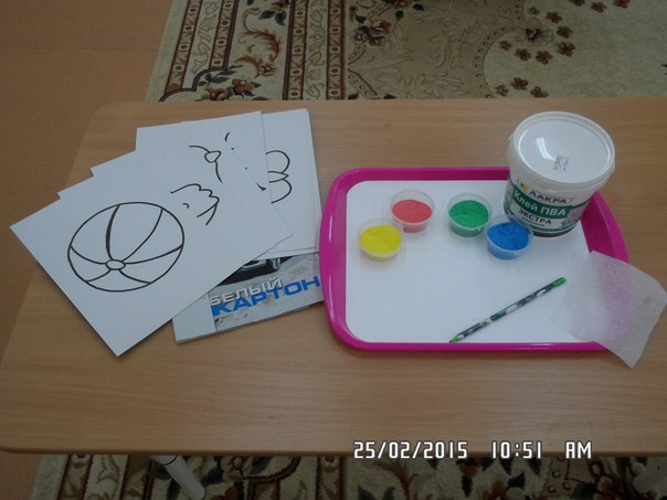 А я использовала еще окрашенную мелкую соль, по структуре, напоминающую песок. На листе бумаги или картона рисуется контур рисунка, смазывается клеем ПВА и насыпается наш «цветной песок». Можно использовать трафареты. Получаются очень яркие картинки.